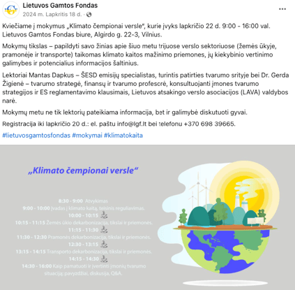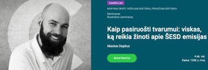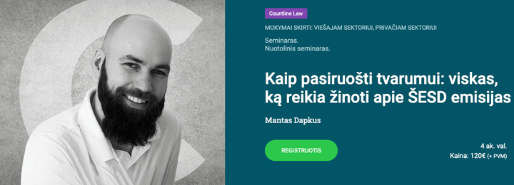 Šiltnamio efektą sukeliančių dujų (ŠESD) emisijos – vienas iš pagrindinių aplinkosaugos iššūkių, su kuriais susiduria visuomenė. Šis seminaras skirtas įmonių vadovams, darbuotojams, atsakingiems už tvarumą, taip pat visiems, kurie domisi aplinkosauga ir siekia prisidėti prie klimato kaitos mažinimo. Seminaro metu dalyviai sužinos, kaip efektyviai skaičiuoti ŠESD emisijas, geriau suprasti jų poveikį aplinkai bei taikyti sprendimus emisijoms mažinti. Įgytos žinios padės geriau suprasti ŠESD emisijų skaičiavimo procesus bei jų mažinimo galimybes, suteikdamos praktinių įrankių tvarumo tikslų įgyvendinimui.